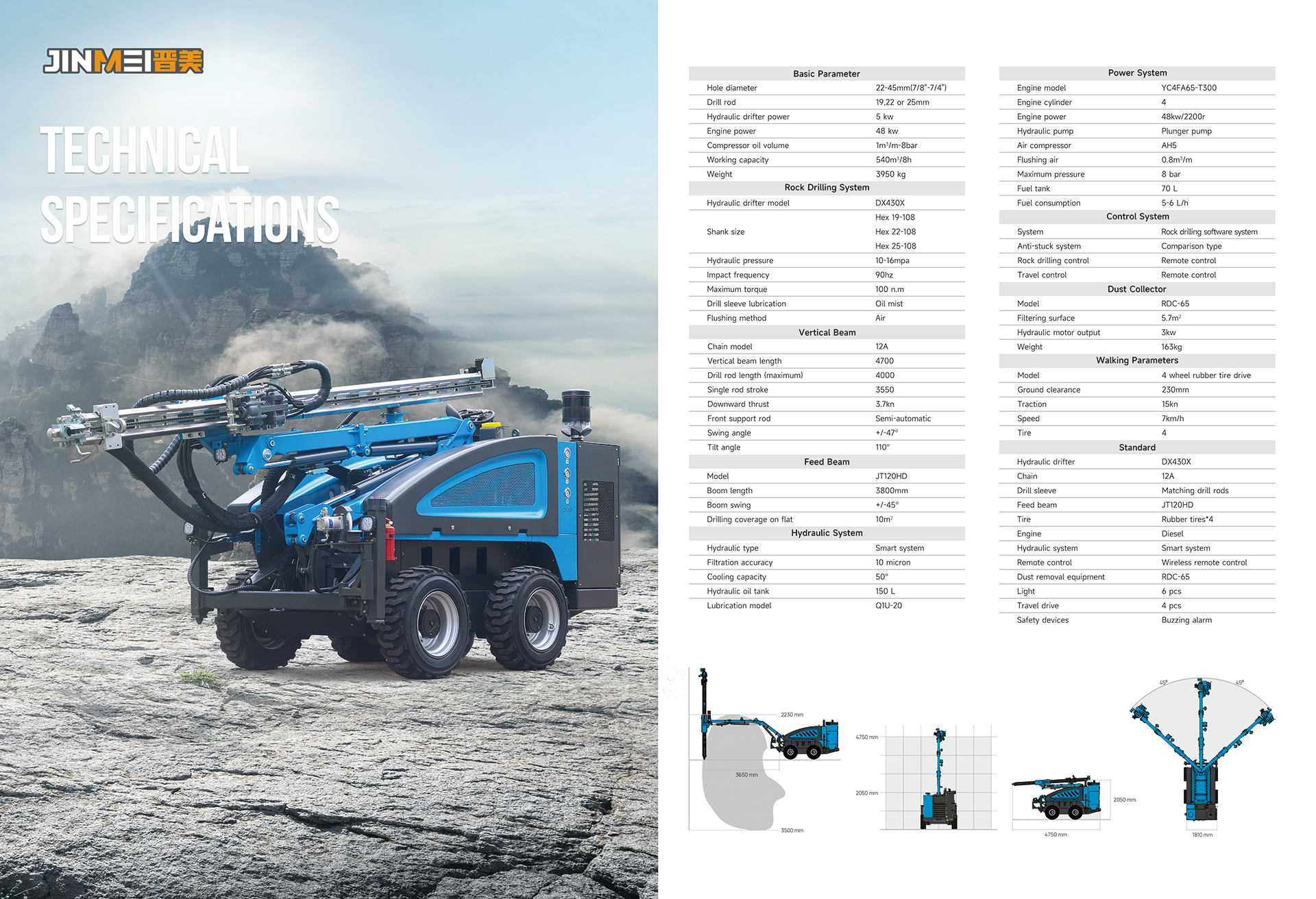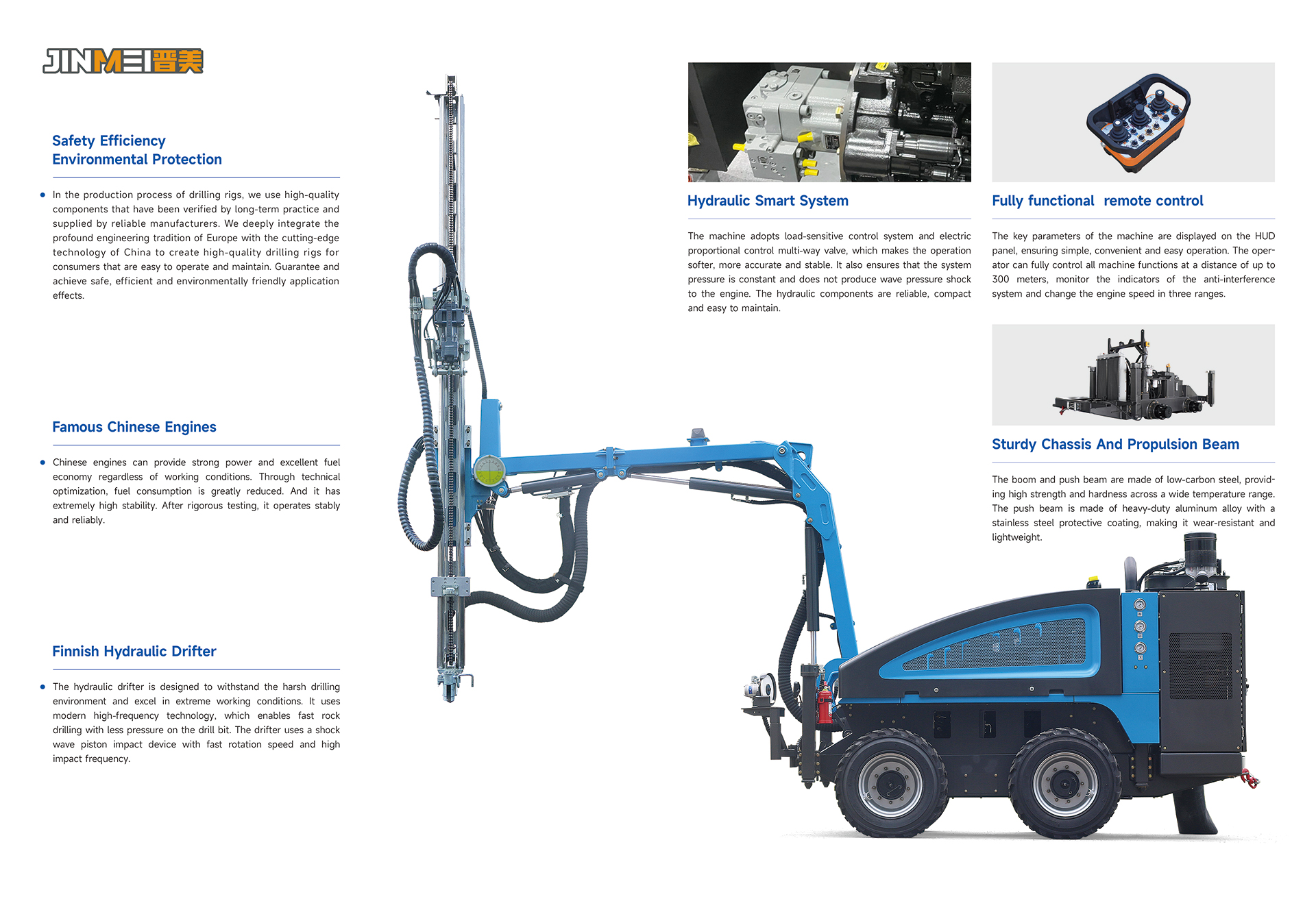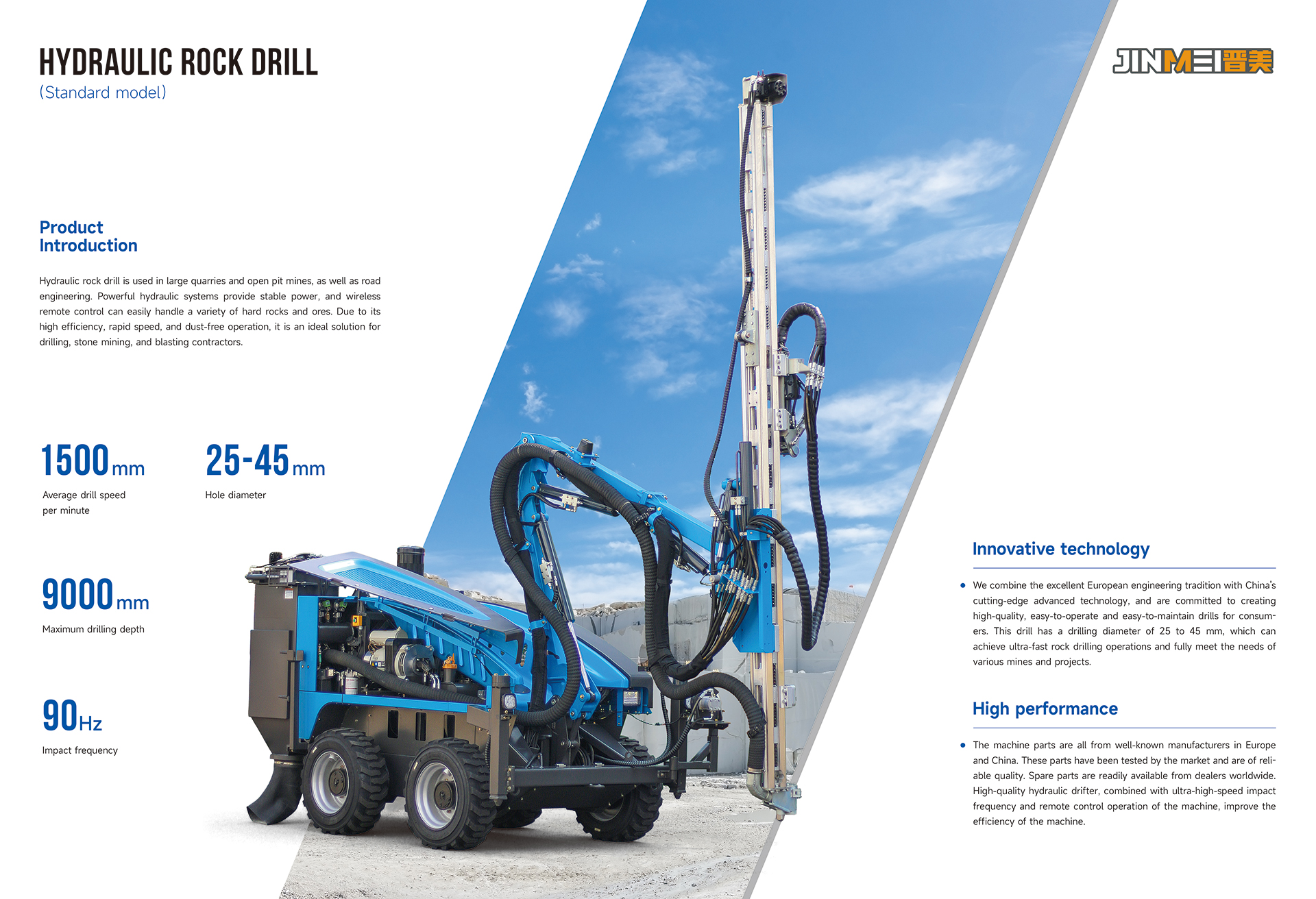 jinmei Hydraulic rock drill is used in large quarries and open pit mines, as well as road engineering. Powerful hydraulic systems provide stable power, and wireless remote control can easily handle a variety of hard rocks and ores. Due to its high efficiency, rapid speed, and dust-free operation, it is an ideal solution for drilling, stone mining, and blasting contractors.